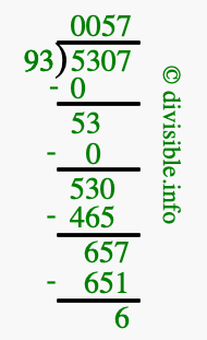 The image displays 57 at the top, which is the quotient, and 6 at the bottom, which is the remainder. Therefore, the answer to 5307 divided by 93 (5307 ÷ 93) using long division is 57 remainder 6, or simply 57 R 6.