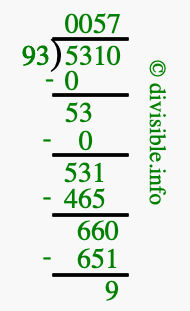 The image displays 57 at the top, which is the quotient, and 9 at the bottom, which is the remainder. Therefore, the answer to 5310 divided by 93 (5310 ÷ 93) using long division is 57 remainder 9, or simply 57 R 9.