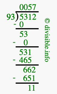 The image displays 57 at the top, which is the quotient, and 11 at the bottom, which is the remainder. Therefore, the answer to 5312 divided by 93 (5312 ÷ 93) using long division is 57 remainder 11, or simply 57 R 11.