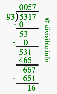 The image displays 57 at the top, which is the quotient, and 16 at the bottom, which is the remainder. Therefore, the answer to 5317 divided by 93 (5317 ÷ 93) using long division is 57 remainder 16, or simply 57 R 16.