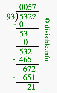 The image displays 57 at the top, which is the quotient, and 21 at the bottom, which is the remainder. Therefore, the answer to 5322 divided by 93 (5322 ÷ 93) using long division is 57 remainder 21, or simply 57 R 21.