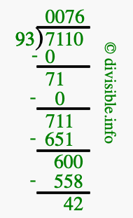 The image displays 76 at the top, which is the quotient, and 42 at the bottom, which is the remainder. Therefore, the answer to 7110 divided by 93 (7110 ÷ 93) using long division is 76 remainder 42, or simply 76 R 42.
