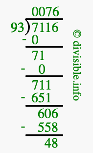 The image displays 76 at the top, which is the quotient, and 48 at the bottom, which is the remainder. Therefore, the answer to 7116 divided by 93 (7116 ÷ 93) using long division is 76 remainder 48, or simply 76 R 48.