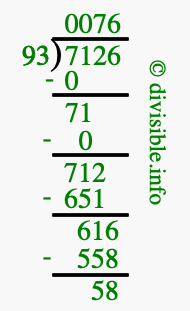The image displays 76 at the top, which is the quotient, and 58 at the bottom, which is the remainder. Therefore, the answer to 7126 divided by 93 (7126 ÷ 93) using long division is 76 remainder 58, or simply 76 R 58.