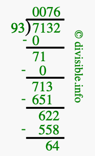 The image displays 76 at the top, which is the quotient, and 64 at the bottom, which is the remainder. Therefore, the answer to 7132 divided by 93 (7132 ÷ 93) using long division is 76 remainder 64, or simply 76 R 64.