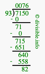 The image displays 76 at the top, which is the quotient, and 82 at the bottom, which is the remainder. Therefore, the answer to 7150 divided by 93 (7150 ÷ 93) using long division is 76 remainder 82, or simply 76 R 82.