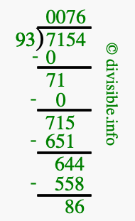 The image displays 76 at the top, which is the quotient, and 86 at the bottom, which is the remainder. Therefore, the answer to 7154 divided by 93 (7154 ÷ 93) using long division is 76 remainder 86, or simply 76 R 86.