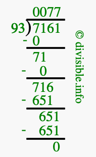 The image displays 77 at the top, which is the quotient, and 0 at the bottom, which is the remainder. Therefore, the answer to 7161 divided by 93 (7161 ÷ 93) using long division is 77 remainder 0, or simply 77 R 0.
