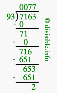 The image displays 77 at the top, which is the quotient, and 2 at the bottom, which is the remainder. Therefore, the answer to 7163 divided by 93 (7163 ÷ 93) using long division is 77 remainder 2, or simply 77 R 2.