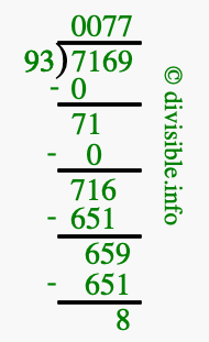 The image displays 77 at the top, which is the quotient, and 8 at the bottom, which is the remainder. Therefore, the answer to 7169 divided by 93 (7169 ÷ 93) using long division is 77 remainder 8, or simply 77 R 8.
