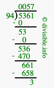 The image displays 57 at the top, which is the quotient, and 3 at the bottom, which is the remainder. Therefore, the answer to 5361 divided by 94 (5361 ÷ 94) using long division is 57 remainder 3, or simply 57 R 3.