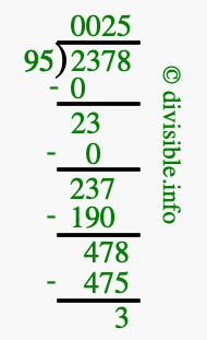 The image displays 25 at the top, which is the quotient, and 3 at the bottom, which is the remainder. Therefore, the answer to 2378 divided by 95 (2378 ÷ 95) using long division is 25 remainder 3, or simply 25 R 3.