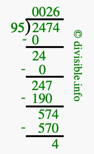 Here we will show you an image that illustrates how to calculate 2474 divided by 95 using long division. We will also give you the answer to 2474 divided by 95 (2474 ÷ 95) as a fraction and as a decimal.