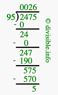 Here we will show you an image that illustrates how to calculate 2475 divided by 95 using long division. We will also give you the answer to 2475 divided by 95 (2475 ÷ 95) as a fraction and as a decimal.