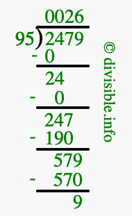 Here we will show you an image that illustrates how to calculate 2479 divided by 95 using long division. We will also give you the answer to 2479 divided by 95 (2479 ÷ 95) as a fraction and as a decimal.