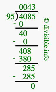 The image displays 43 at the top, which is the quotient, and 0 at the bottom, which is the remainder. Therefore, the answer to 4085 divided by 95 (4085 ÷ 95) using long division is 43 remainder 0, or simply 43 R 0.