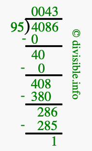 The image displays 43 at the top, which is the quotient, and 1 at the bottom, which is the remainder. Therefore, the answer to 4086 divided by 95 (4086 ÷ 95) using long division is 43 remainder 1, or simply 43 R 1.