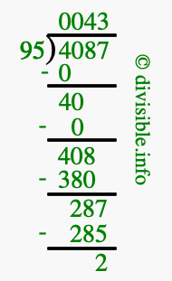 The image displays 43 at the top, which is the quotient, and 2 at the bottom, which is the remainder. Therefore, the answer to 4087 divided by 95 (4087 ÷ 95) using long division is 43 remainder 2, or simply 43 R 2.
