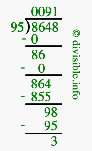 The image displays 91 at the top, which is the quotient, and 3 at the bottom, which is the remainder. Therefore, the answer to 8648 divided by 95 (8648 ÷ 95) using long division is 91 remainder 3, or simply 91 R 3.