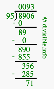 The image displays 93 at the top, which is the quotient, and 71 at the bottom, which is the remainder. Therefore, the answer to 8906 divided by 95 (8906 ÷ 95) using long division is 93 remainder 71, or simply 93 R 71.