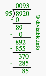 Here we will show you an image that illustrates how to calculate 8920 divided by 95 using long division. We will also give you the answer to 8920 divided by 95 (8920 ÷ 95) as a fraction and as a decimal.