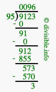 Here we will show you an image that illustrates how to calculate 9123 divided by 95 using long division. We will also give you the answer to 9123 divided by 95 (9123 ÷ 95) as a fraction and as a decimal.