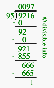 The image displays 97 at the top, which is the quotient, and 1 at the bottom, which is the remainder. Therefore, the answer to 9216 divided by 95 (9216 ÷ 95) using long division is 97 remainder 1, or simply 97 R 1.