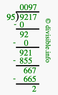 The image displays 97 at the top, which is the quotient, and 2 at the bottom, which is the remainder. Therefore, the answer to 9217 divided by 95 (9217 ÷ 95) using long division is 97 remainder 2, or simply 97 R 2.