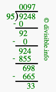 The image displays 97 at the top, which is the quotient, and 33 at the bottom, which is the remainder. Therefore, the answer to 9248 divided by 95 (9248 ÷ 95) using long division is 97 remainder 33, or simply 97 R 33.
