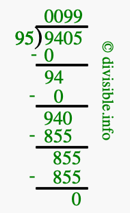 Here we will show you an image that illustrates how to calculate 9405 divided by 95 using long division. We will also give you the answer to 9405 divided by 95 (9405 ÷ 95) as a fraction and as a decimal.
