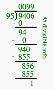 The image displays 99 at the top, which is the quotient, and 1 at the bottom, which is the remainder. Therefore, the answer to 9406 divided by 95 (9406 ÷ 95) using long division is 99 remainder 1, or simply 99 R 1.