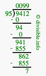 The image displays 99 at the top, which is the quotient, and 7 at the bottom, which is the remainder. Therefore, the answer to 9412 divided by 95 (9412 ÷ 95) using long division is 99 remainder 7, or simply 99 R 7.