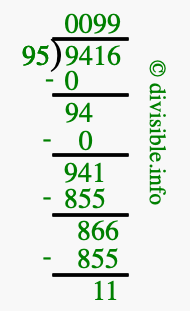 The image displays 99 at the top, which is the quotient, and 11 at the bottom, which is the remainder. Therefore, the answer to 9416 divided by 95 (9416 ÷ 95) using long division is 99 remainder 11, or simply 99 R 11.