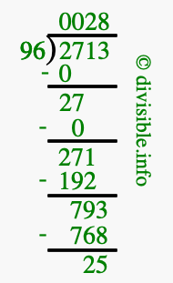 The image displays 28 at the top, which is the quotient, and 25 at the bottom, which is the remainder. Therefore, the answer to 2713 divided by 96 (2713 ÷ 96) using long division is 28 remainder 25, or simply 28 R 25.