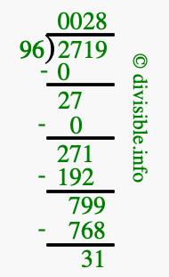 The image displays 28 at the top, which is the quotient, and 31 at the bottom, which is the remainder. Therefore, the answer to 2719 divided by 96 (2719 ÷ 96) using long division is 28 remainder 31, or simply 28 R 31.