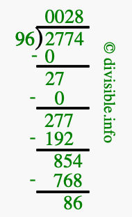 The image displays 28 at the top, which is the quotient, and 86 at the bottom, which is the remainder. Therefore, the answer to 2774 divided by 96 (2774 ÷ 96) using long division is 28 remainder 86, or simply 28 R 86.