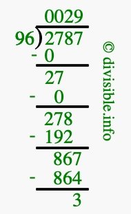 The image displays 29 at the top, which is the quotient, and 3 at the bottom, which is the remainder. Therefore, the answer to 2787 divided by 96 (2787 ÷ 96) using long division is 29 remainder 3, or simply 29 R 3.