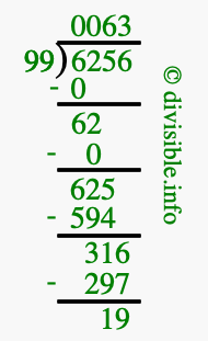 The image displays 63 at the top, which is the quotient, and 19 at the bottom, which is the remainder. Therefore, the answer to 6256 divided by 99 (6256 ÷ 99) using long division is 63 remainder 19, or simply 63 R 19.