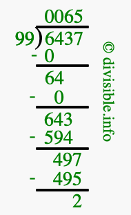 The image displays 65 at the top, which is the quotient, and 2 at the bottom, which is the remainder. Therefore, the answer to 6437 divided by 99 (6437 ÷ 99) using long division is 65 remainder 2, or simply 65 R 2.