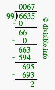 The image displays 67 at the top, which is the quotient, and 2 at the bottom, which is the remainder. Therefore, the answer to 6635 divided by 99 (6635 ÷ 99) using long division is 67 remainder 2, or simply 67 R 2.