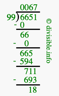 The image displays 67 at the top, which is the quotient, and 18 at the bottom, which is the remainder. Therefore, the answer to 6651 divided by 99 (6651 ÷ 99) using long division is 67 remainder 18, or simply 67 R 18.