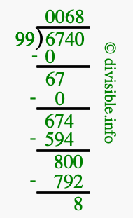Here we will show you an image that illustrates how to calculate 6740 divided by 99 using long division. We will also give you the answer to 6740 divided by 99 (6740 ÷ 99) as a fraction and as a decimal.