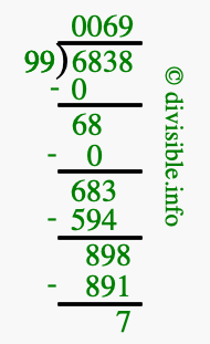 The image displays 69 at the top, which is the quotient, and 7 at the bottom, which is the remainder. Therefore, the answer to 6838 divided by 99 (6838 ÷ 99) using long division is 69 remainder 7, or simply 69 R 7.