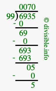 The image displays 70 at the top, which is the quotient, and 5 at the bottom, which is the remainder. Therefore, the answer to 6935 divided by 99 (6935 ÷ 99) using long division is 70 remainder 5, or simply 70 R 5.