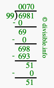 The image displays 70 at the top, which is the quotient, and 51 at the bottom, which is the remainder. Therefore, the answer to 6981 divided by 99 (6981 ÷ 99) using long division is 70 remainder 51, or simply 70 R 51.