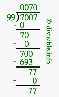 The illustration below shows you how to calculate 7007 divided by 99 using long division. As you can see, the dividend value of 7007 is located to the right of the "⟌" and the divisor value of 99 is located to the left of the "⟌".