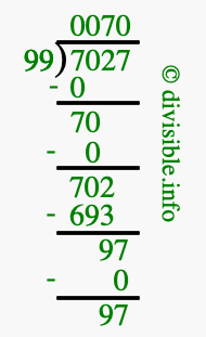 The illustration below shows you how to calculate 7027 divided by 99 using long division. As you can see, the dividend value of 7027 is located to the right of the "⟌" and the divisor value of 99 is located to the left of the "⟌".