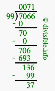 The image displays 71 at the top, which is the quotient, and 37 at the bottom, which is the remainder. Therefore, the answer to 7066 divided by 99 (7066 ÷ 99) using long division is 71 remainder 37, or simply 71 R 37.