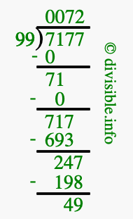 The image displays 72 at the top, which is the quotient, and 49 at the bottom, which is the remainder. Therefore, the answer to 7177 divided by 99 (7177 ÷ 99) using long division is 72 remainder 49, or simply 72 R 49.